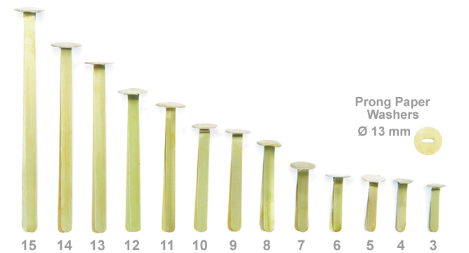 The Round-Head Fastener and Prong Paper Washers are made of yellow coated steel. The Round-Head Fastener are also known as "ballet dancer".