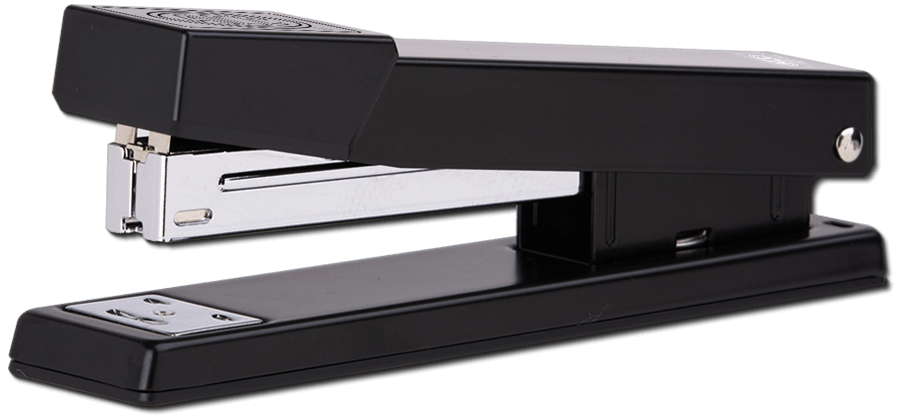 Grampeador grande, medindo 168mm de comprimento, fabricado em aço e pintura eletrostática. Utiliza grampos 24/6 e 26/6. Permite grampear até 25 folhas (75g/m²) com grampos 24/6.